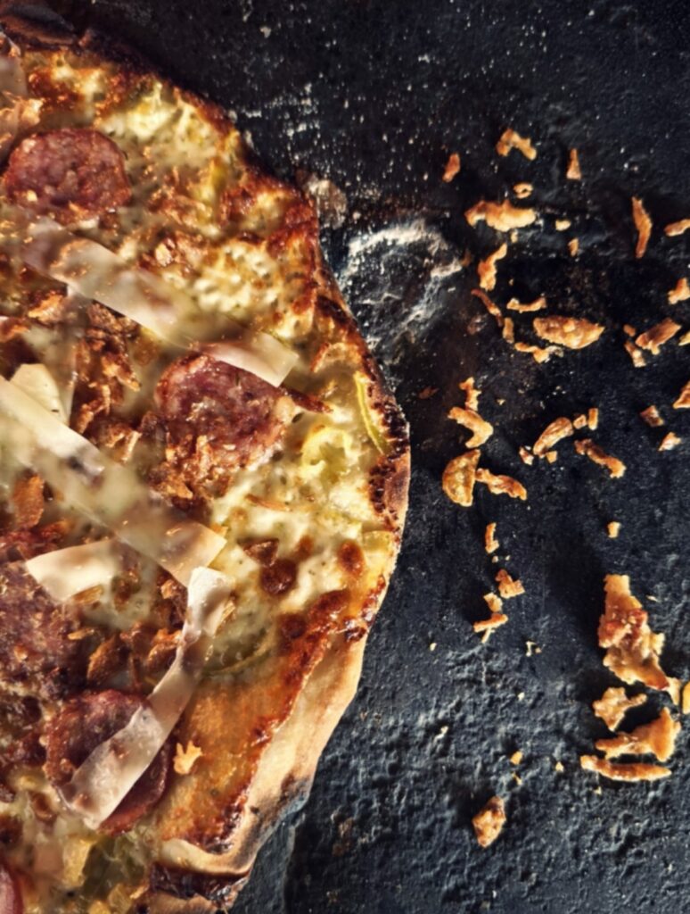 Base crème et poireaux, mozzarella fior di late, saucisse de Montbéliard, comté 18 mois et oignons frits en sortie de four.